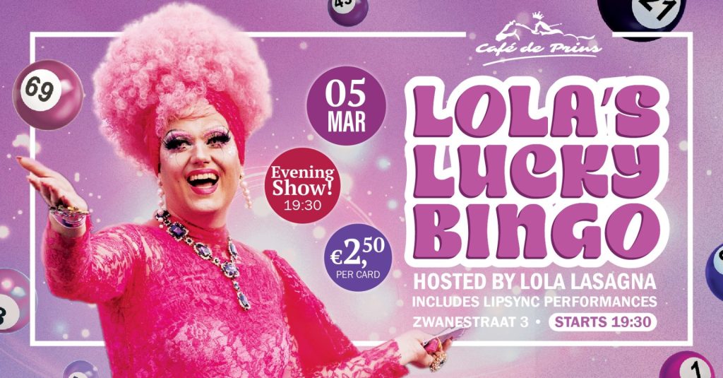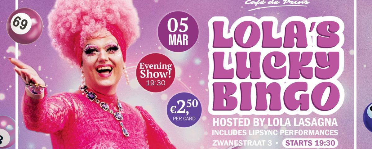 Darling, het is weer zover. Lola Lasagna is terug met haar befaamde bingoshow: Lola’s Lucky Bingo! Dit keer in de vorm van een gevarieerd avondprogramma tsjokvol met lipsync performances, bingorondes, fan-TAS-tische prijzen en de heerlijkste cocktails. Kom gezellig langs op donderdag 5 maart voor een geweldige avondbingo én dragshow in Café de Prins!